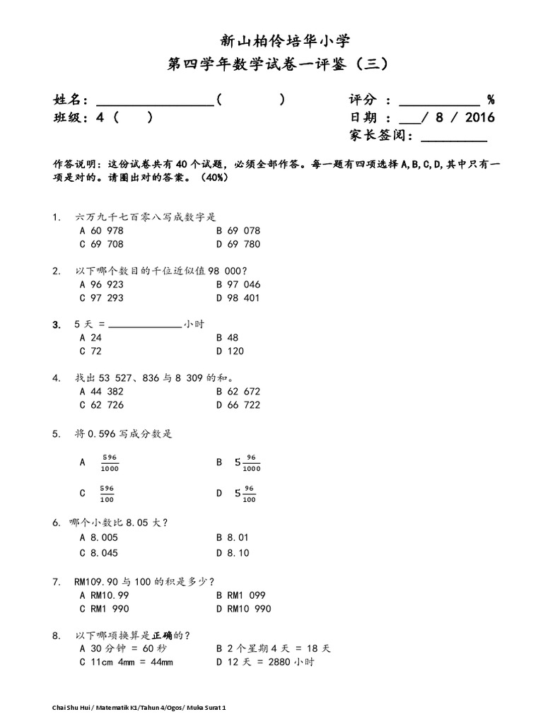 Year 4 Paper 1 Matematik Ogos Pdf