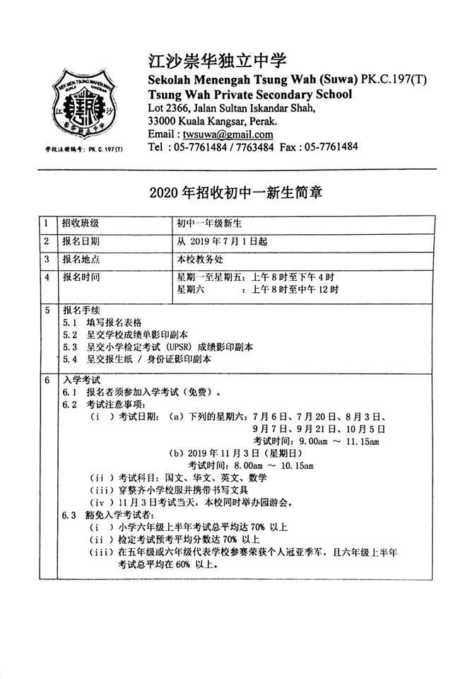 2020年度新生班级查询 Chong Hwa Independent High School